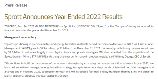 斯普羅特首席執行官指出,公司亦受益于收購Sprott Uranium Miners ETF(斯普羅特鈾礦基金股票,代碼URNM)以及貴金屬的強勁年末表現。斯普羅特首席執行官表示:“我們繼續擴大能源轉型業務,在成功的鈾戰略基礎上再接再厲。2022年7月,我們推出了一項積極管理的能源轉型戰略,充分利用我們深厚的投資組合經理和分析師團隊;2023年2月,公司推出了4種新能源轉型主題的ETF,我們預計今年將推出更多產品。”
