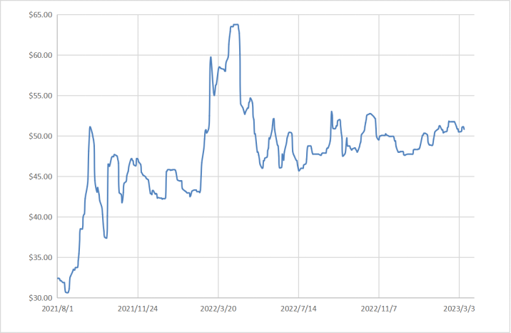 3月10日(周五)消息,美國加州金融保護與創新部門(DFPI)宣布委任美國聯邦存款保險公司(FDIC)接管硅谷銀行,硅谷銀行周五已被下令關閉。這是自2008年全球金融危機以來美國最大的銀行倒閉事件。硅谷銀行被接管,引發市場對其他區域銀行以至金融體系的擔憂,三大美股指急瀉,道指一周跌1481點(﹣4.44%),標普500指數一周跌184點(﹣4.55%),納指一周跌550點(﹣4.71%)。受到非實物信托基金買家進場采購牽引,本周初期天然鈾現貨交易氣氛濃烈,數單場外交易推動現貨鈾價從50.50美元/磅急升至51.40美元/磅(單天升0.90美元/磅)。隨后沒有更多新買家進場,市場需求明顯減退,周五現貨鈾價回落至50.75美元/磅收盤。