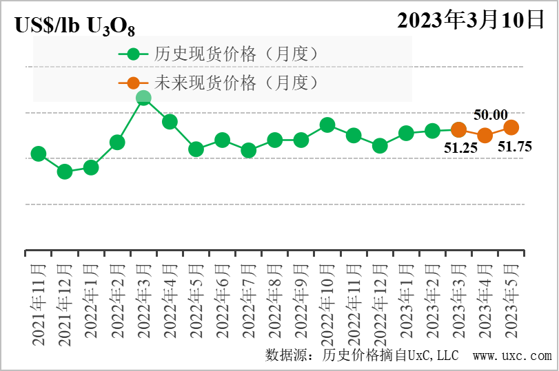 2023年3月10日,中國核能行業協會發布第28期“CNEA國際天然鈾價格預測指數(2023年3月)”。