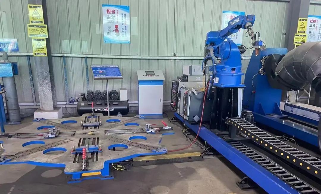 全系列風管自動焊機器人工作站主要由2套焊接機器人焊接系統、4套焊接工裝及配套激光視覺跟蹤系統構成,可開展不同種類的自動焊焊接作業。機器人還首次采用一套焊接系統搭配兩套工裝夾具使用,可同時兩側錯峰開展焊接作業,進一步提高焊接效率。