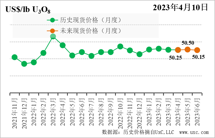 3月份的現(xiàn)貨市場(chǎng)整體較為冷清。3月初的天然鈾價(jià)格為50.50美元/磅,隨后價(jià)格小幅上漲至51.25美元/磅,但隨著美國(guó)硅谷銀行危機(jī)事件發(fā)生,資本市場(chǎng)低迷,3月8日至16日,價(jià)格持續(xù)下跌至49.75美元/磅,此后一周,現(xiàn)貨價(jià)格保持在50.00美元/磅。本月最后一周,市場(chǎng)出現(xiàn)零星交易,月底天然鈾價(jià)格收于50.75美元/磅。