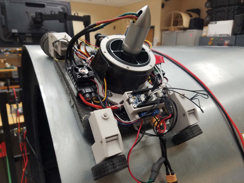 爬行利用電子管道風(fēng)扇產(chǎn)生動(dòng)力,使系統(tǒng)能夠在排氣通道內(nèi)3英尺直徑的鋁管道整個(gè)圓周上導(dǎo)航爬行,移動(dòng)平臺(tái)由我們的合作者開(kāi)發(fā)。