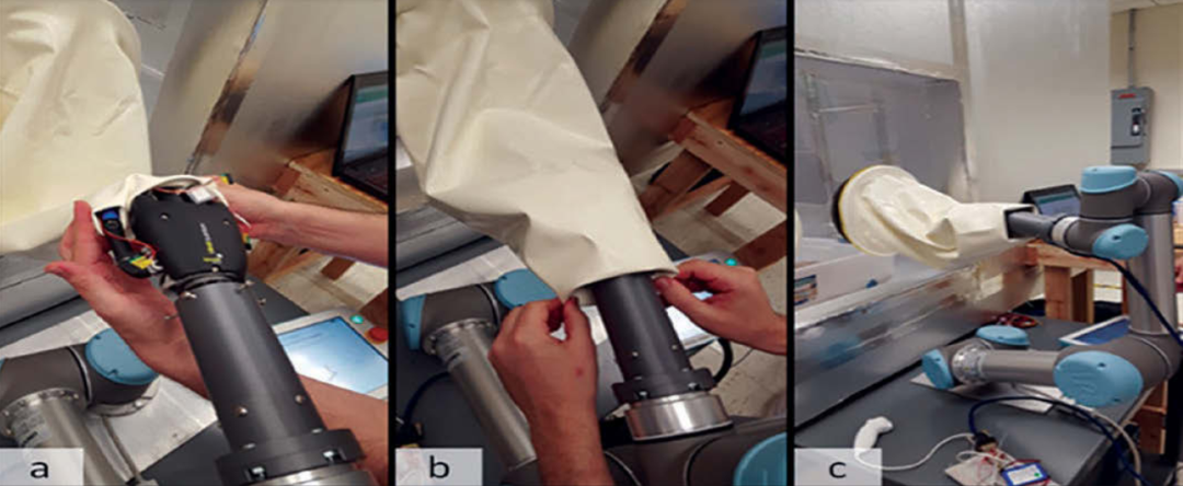 圖7:將手插入手套箱進(jìn)行測(cè)試的步驟:(a)將指尖插入手套的初始手姿勢(shì),(b)將手完全插入手套,以及(c)將手插入到手套箱的手臂。