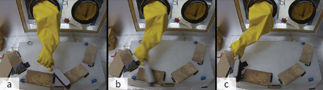 四塊磚被放置在手套箱中,呈弧形配置,這樣機(jī)器人就可以夠到每一塊磚。