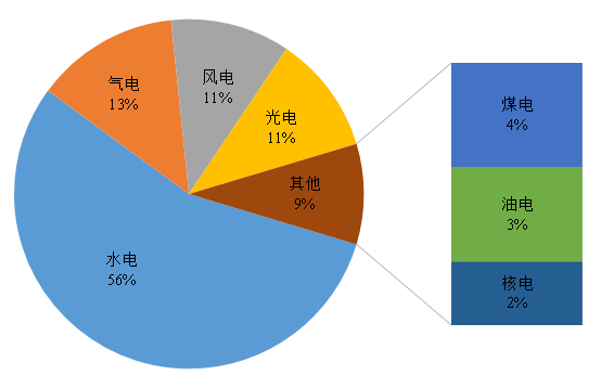 2021年,巴西總發電量為6544億千瓦時。其中,水電是巴西第一大電力來源,水電發電量為3628億千瓦時,在全國電力結構中占比55.4%。巴西燃氣發電量為869億千瓦時、風電發電量為723億千瓦時、光伏發電量為717億千瓦時、燃煤發電量為241億千瓦時、燃油發電量為219億千瓦時、核電發電量為147億千瓦時。人均全社會用電量約為2580千瓦時/人。由于國土面積大部分位于熱帶雨林地區,巴西有豐富的水電資源,水電也成為了巴西最大的電力來源。巴西水電在國家電力結構中的占比僅次于加拿大,位居世界第二位。水電占比大,也使得巴西在干旱的年份也容易出現用電短缺情況,為此巴西積極發展核電等電力形式,減少對水電的過分依賴。
