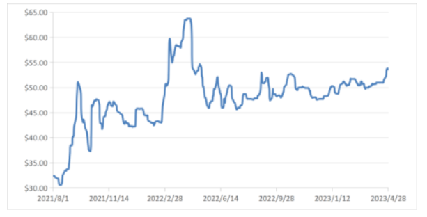 2021年8月—2023年4月單日現(xiàn)貨鈾價