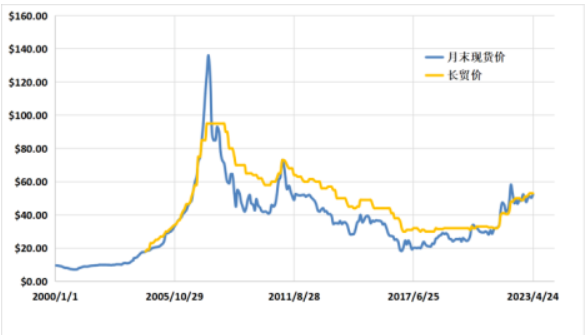 2000年1月—2023年4月末現(xiàn)貨鈾價和長貿(mào)鈾價