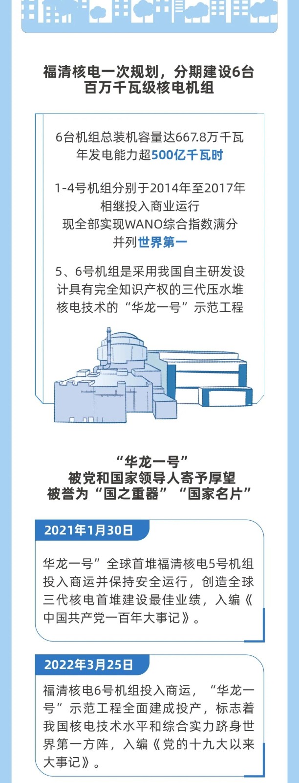 2015年華龍一號(hào)全球首堆示范工程落戶福清開工建設(shè),入選《中華人民共和國(guó)大事記》。2021年華龍一號(hào)全球首堆投入商運(yùn),入編《中國(guó)共產(chǎn)黨一百年大事記》。2022年華龍一號(hào)全球首堆示范工程全面建成,入編《黨的十九大以來大事記》,亮相“奮進(jìn)新時(shí)代”主題展,連續(xù)兩年榮獲央企“十大國(guó)之重器”稱號(hào)。2023年4月27日,福清核電榮獲全國(guó)五一勞動(dòng)獎(jiǎng)狀。