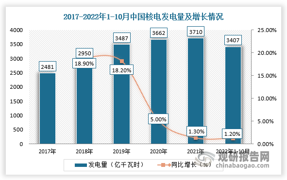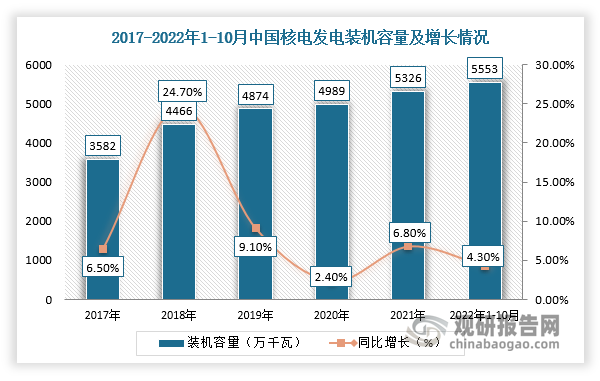 根據(jù)數(shù)據(jù)顯示,2021年,中國核電發(fā)電量3710億千瓦時,同比增長1.3%,裝機容量5326萬千瓦,同比增長6.8%,6000千瓦及以上核電廠發(fā)電設(shè)備利用7802小時,同比增長4.7%;截止2022年1-10月,中國核電裝機容量5553萬千瓦,同比增長4.3%,核電新增裝機容量474萬千瓦,同比下降112萬千瓦,發(fā)電量3407億千瓦時,同比增長1.2%,核電發(fā)電設(shè)備累計平均利用6226小時,比上年同期減少245小時。同時,國家“十四五”規(guī)劃綱要明確,到2025年在運核電裝機7000萬千瓦,預(yù)計到2025年,中國核電在建裝機約5000萬千瓦;到2030年,核電在運裝機容量達(dá)到1.2億千瓦,核電發(fā)電量約占全國發(fā)電量的8%。由此可見,我國核電行業(yè)發(fā)展空間大。