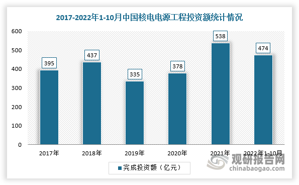 創(chuàng)新是產(chǎn)業(yè)高質(zhì)量發(fā)展的核心驅(qū)動力。近年來,我國持續(xù)加大對核電產(chǎn)業(yè)的科研攻關(guān)力度,2017-2021年的核電電源工程投資額持續(xù)增加,并且預(yù)計在“十四五”期,我國核能科技創(chuàng)新的投入力度將進一步增強,先進核能技術(shù)也將快速突破和發(fā)展。根據(jù)數(shù)據(jù)顯示,2021年中國核電電源工程投資額538億元,截止2022年1-10月完成投資474億元,同比增長19.9%。