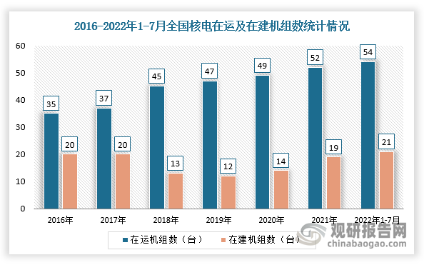 根據(jù)數(shù)據(jù)顯示,截至2022年7月,我國在運核電機組累計為54臺,裝機容量約52150兆瓦,在建核電機組共21臺(其中有10臺采用的是華龍一號),總裝機容量約23511兆瓦,并且在運及在建核電機組均位于沿海地區(qū)。