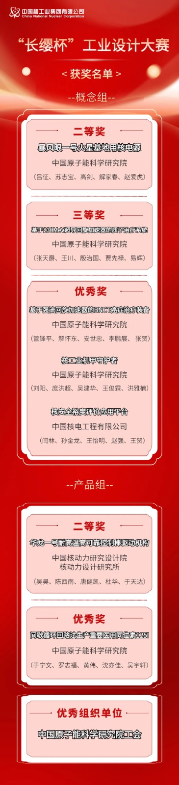 其中,中國原子能科學(xué)研究院共斬獲7項(xiàng)榮譽(yù):在“長纓杯”工業(yè)設(shè)計(jì)大賽中,“暴風(fēng)眼一號(hào)火星基地用核電源”、“基于230MeV超導(dǎo)回旋加速器的質(zhì)子治療系統(tǒng)”項(xiàng)目團(tuán)隊(duì)分別獲得“概念組”二、三等獎(jiǎng);“基于強(qiáng)流回旋加速器的BNCT癌癥治療裝備”、“核工業(yè)機(jī)甲守護(hù)者”項(xiàng)目團(tuán)隊(duì)獲得“概念組”優(yōu)秀獎(jiǎng);“間歇循環(huán)回路法生產(chǎn)重要醫(yī)用同位素125I”項(xiàng)目團(tuán)隊(duì)獲得“產(chǎn)品組”優(yōu)秀獎(jiǎng)。“中國原子能科學(xué)研究院工會(huì)”分別獲得“長纓杯”工業(yè)設(shè)計(jì)大賽“產(chǎn)品組”和首屆工藝技術(shù)創(chuàng)新大賽“機(jī)械制造組”優(yōu)秀組織單位稱號(hào)。