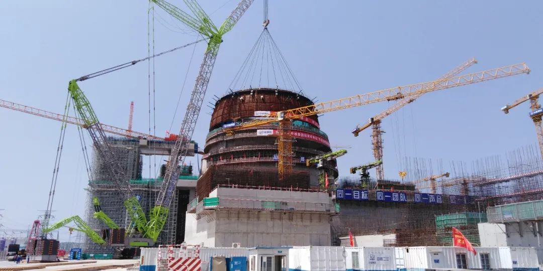 兩年之后同一天,2023年5月19日,中核集團旗下中國核電投資控股田灣核電7號機組穹頂球帶成功吊裝,標志著該機組從土建施工高峰全面轉入安裝階段!