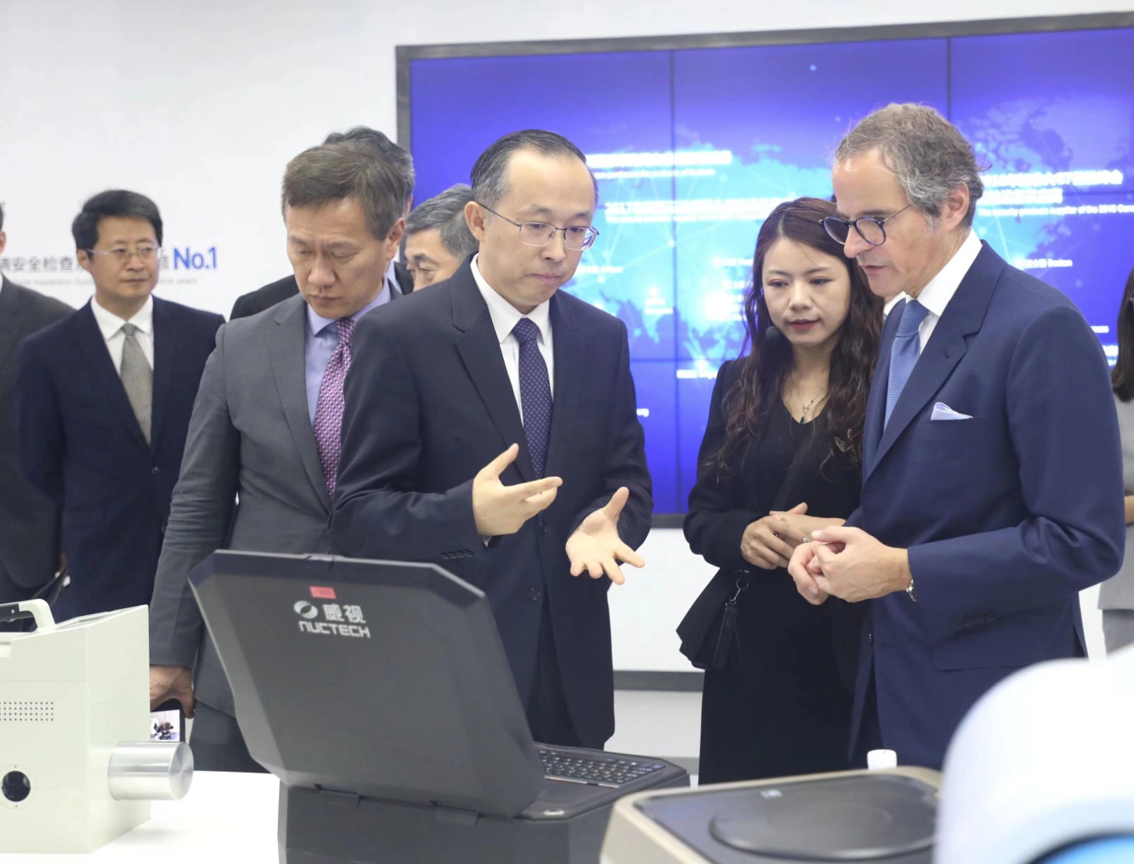 在同方威視新視界展廳,陳志強(qiáng)董事長對格羅西及代表團(tuán)成員的到訪表示熱烈歡迎,簡要介紹了同方威視的起源與發(fā)展。展廳參觀期間,同方威視展示了基于民用核技術(shù)在海關(guān)、民航、大型活動(dòng)、軌道交通、礦石分選、無損檢測、輻照加工等行業(yè)領(lǐng)域創(chuàng)新成果和全球市場應(yīng)用,著重介紹了自主研發(fā)的基于碳納米管冷陰極分布式光源的全球首套靜態(tài)CT成像裝置及其在安檢、無損檢測、醫(yī)療領(lǐng)域的應(yīng)用前景,演示了同方威視拉曼液體安檢儀、手持式背散射安檢儀、手持式物質(zhì)識別儀等多款便攜式產(chǎn)品。