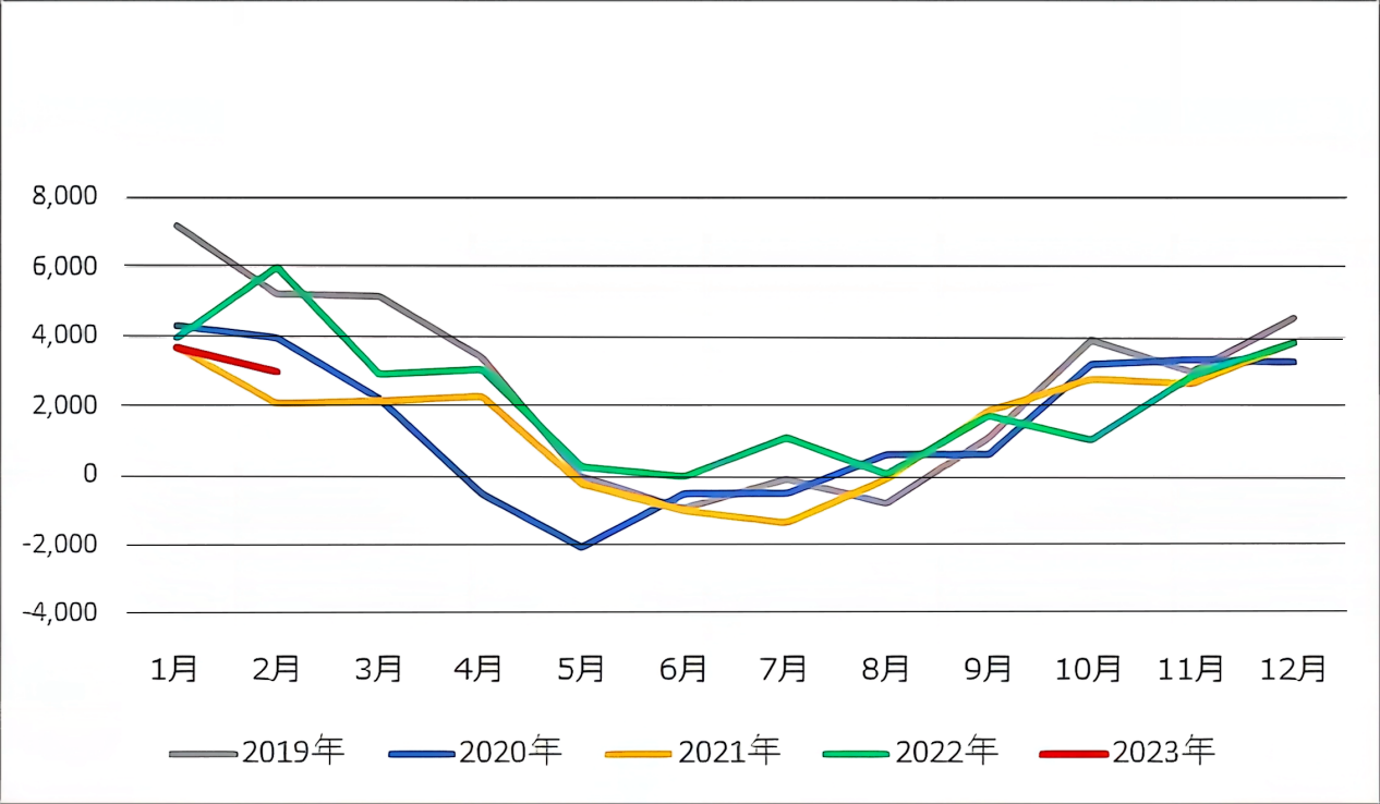 圖3 德國跨國電力交易輸出輸入量對比(1990—2022年)(單位:太瓦時)其次,如圖4所示,德國跨國電力交易量因季節變化而變化。德國夏季天氣涼爽,居民一般不使用空調,夏季電力需求會有所減少。很多發電廠會利用夏季對發電設備進行檢修、維護和保養,此時德國就會增加周邊國家的電力進口;德國冬季電力需求增多,隨著國內發電量增加也會增加電力出口。德國供暖主要以天然氣為主,而法國暖氣用電比例很高,因此冬季輸出法國電力比例較高。從圖5就可以看出德法之間這種需求互補的季節性變化特點。2022年德國跨國電力交易輸出大于輸入的幅度同比增加了50%,達到26.3太瓦時。從用戶側來說,由于冬季氣候偏暖,電費大幅上漲等因素,電力消費量同比減少了約4.1%。從發電側來說,盡管核電機組從6臺減少為3臺,氣電又遭遇氣荒,但通過大幅增加可再生能源發電和重啟一批煤電機組補缺,對供電穩定性影響不大。進入2023年以后,1月和2月的走勢基本與往年相同。
