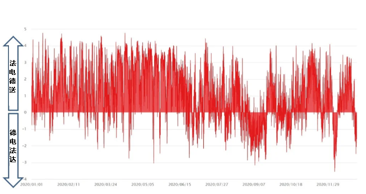 圖5 德國與法國之間進出口電力負荷曲線圖(2020年)(單位:吉瓦)