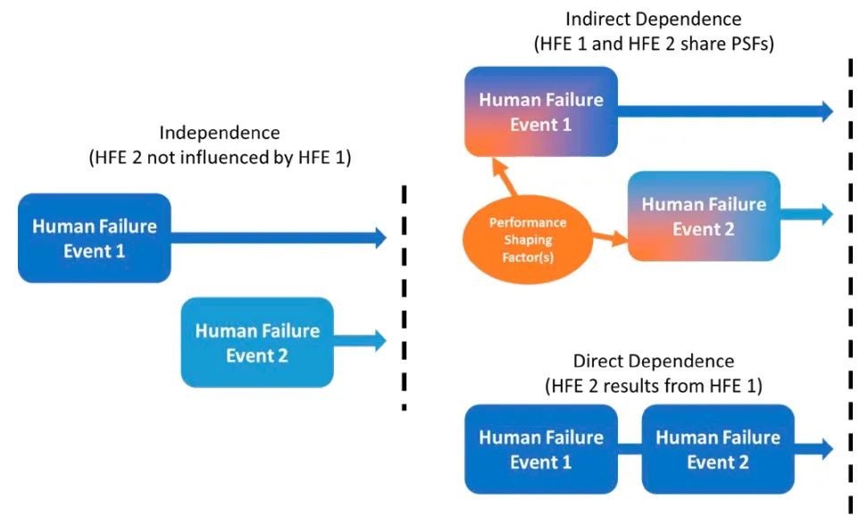 人力可靠性分析中,建模的不同類型依賴關(guān)系說明。