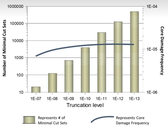 作為核電站PRA中復(fù)雜性類型的一個(gè)例子,見右圖,隨著通過將PRA模型量化截?cái)嗨浇档偷皆絹碓叫〉闹祦聿东@額外的細(xì)節(jié),最小割集的數(shù)量(即,電廠可能經(jīng)歷堆芯損傷方式的不同組合)變得非常大,其中組合不被認(rèn)為低于該頻率水平。