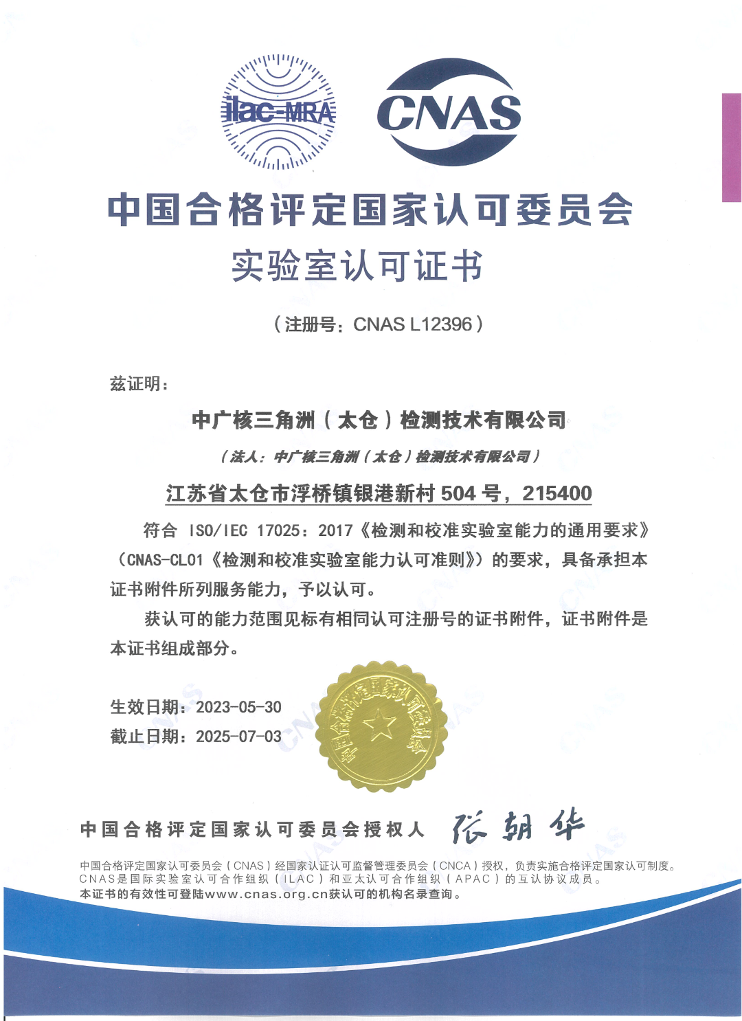 2023年5月30日,中廣核高新核材集團下屬中廣核(太倉)檢測公司順利通過中國合格評定國家認可委員會CNAS實驗室認可,標志著公司具備了按照相關國際認可準則開展檢測和校準服務的技術能力。