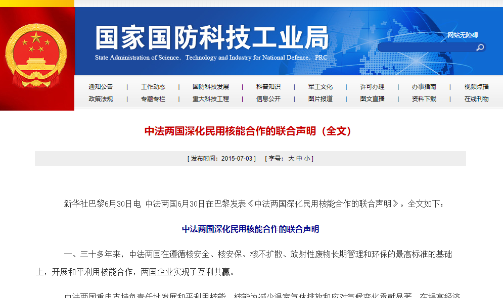 早在2015年06月30日,中法兩國就在巴黎簽署了《深化民用核能合作的聯(lián)合聲明》,感興趣的可以通過閱讀原文查閱。