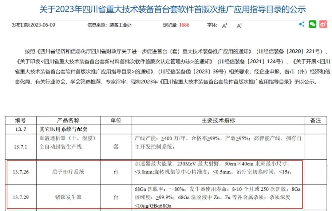 近日,四川省經濟和信息化廳公布2023年度《四川省重大技術裝備首臺套軟件首次推廣應用指導目錄》,中廣核技“質子治療系統”和“鍺鎵發生器”兩項核醫療產品成功入選。