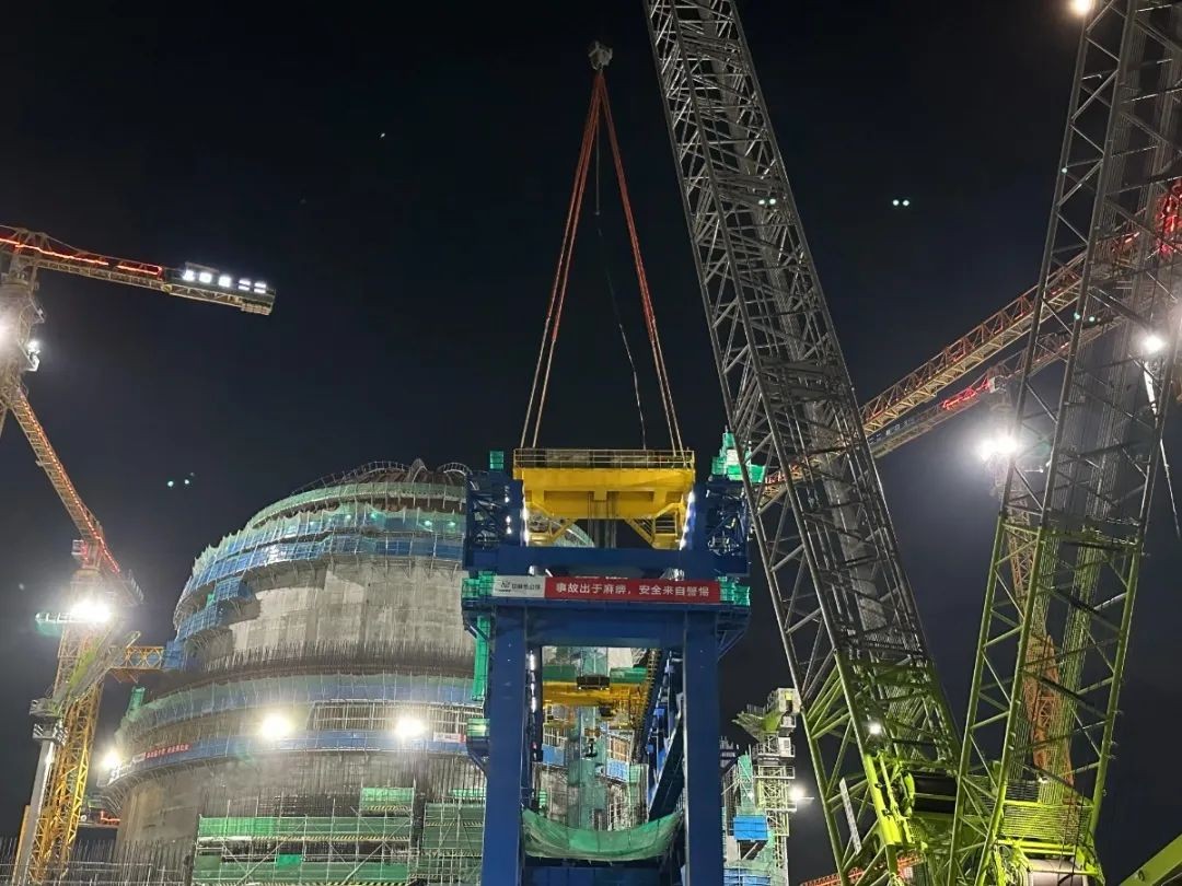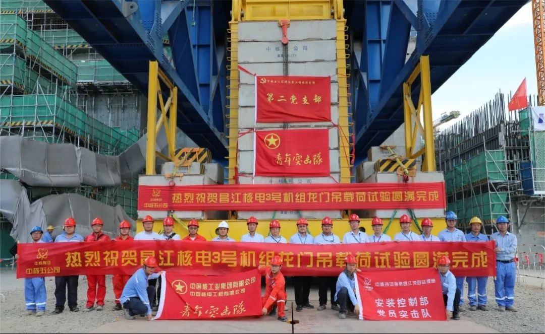 2023年7月14日下午16:18,華能海南昌江核電二期工程3號機組龍門吊450t小車額定載荷試驗的配重緩緩落下,龍門吊450t吊車載荷試驗圓滿成功,標志著3號機組龍門吊全部具備可用條件。又一重大里程碑節點完成,為后續首臺蒸汽發生器的引入打下了堅實基礎。