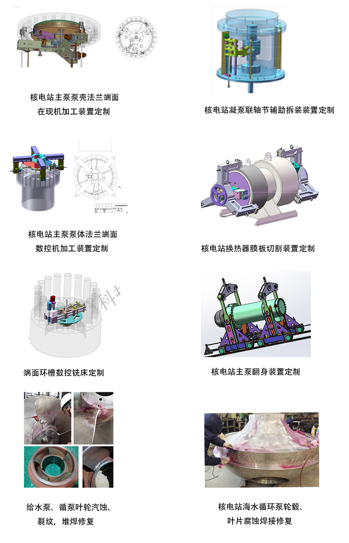 非標機電裝置研發與制造,實現在特定環境與工況下某種特定的功能要求。研發制造各種現場機加工裝備,對軸頸、平面、孔座、法蘭等設備,在現進行車、銑、磨等機加工,同時可根據需要進行遙控、數控控制;軸頸、葉輪、閥芯、泵殼等類型設備,劃傷、磨損、汽蝕、裂紋焊接修復。