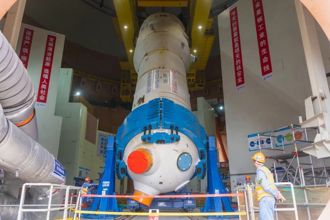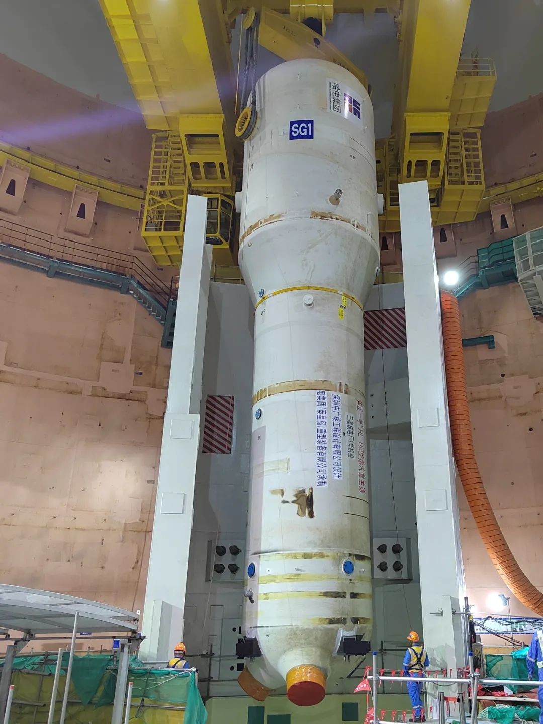 蒸汽發生器凈重390噸,長約21米,直徑4.6米,是反應堆冷卻劑系統的關鍵設備之一。它將堆芯產生的熱量傳遞給二回路中的冷卻水,使之轉化為飽和蒸汽,蒸汽推動汽輪發電機將能量最終轉化為電能。