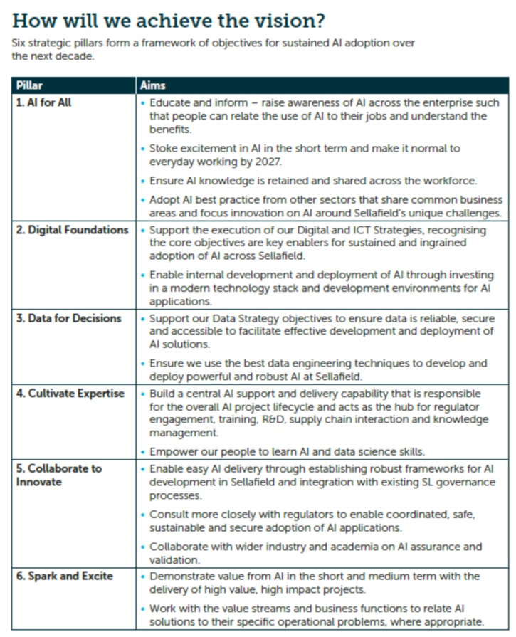 塞拉菲爾德公司的人工智能戰略建立在六大核心支柱基礎上。這些支柱對在資產管理、現場作業支持和職能部門這三個核心領域應用人工智能至關重要。