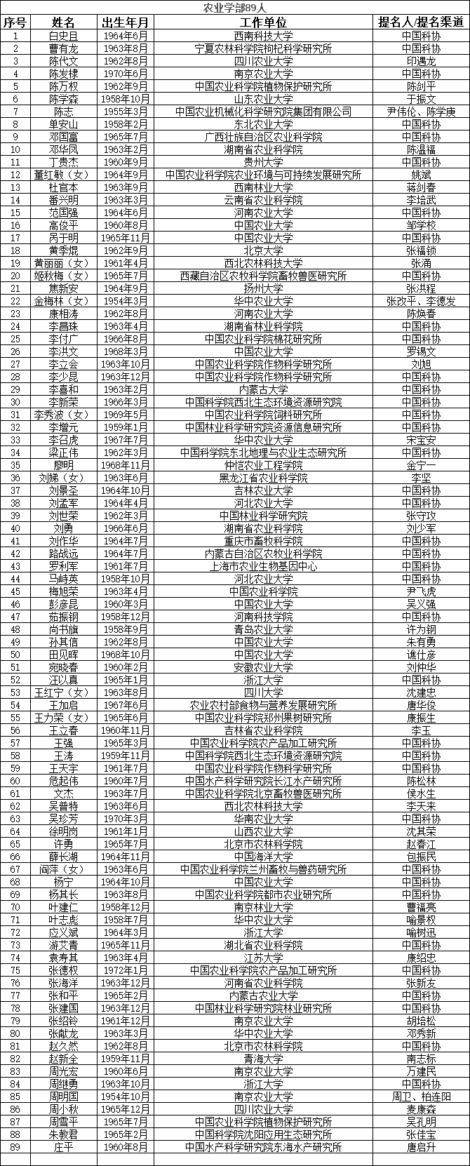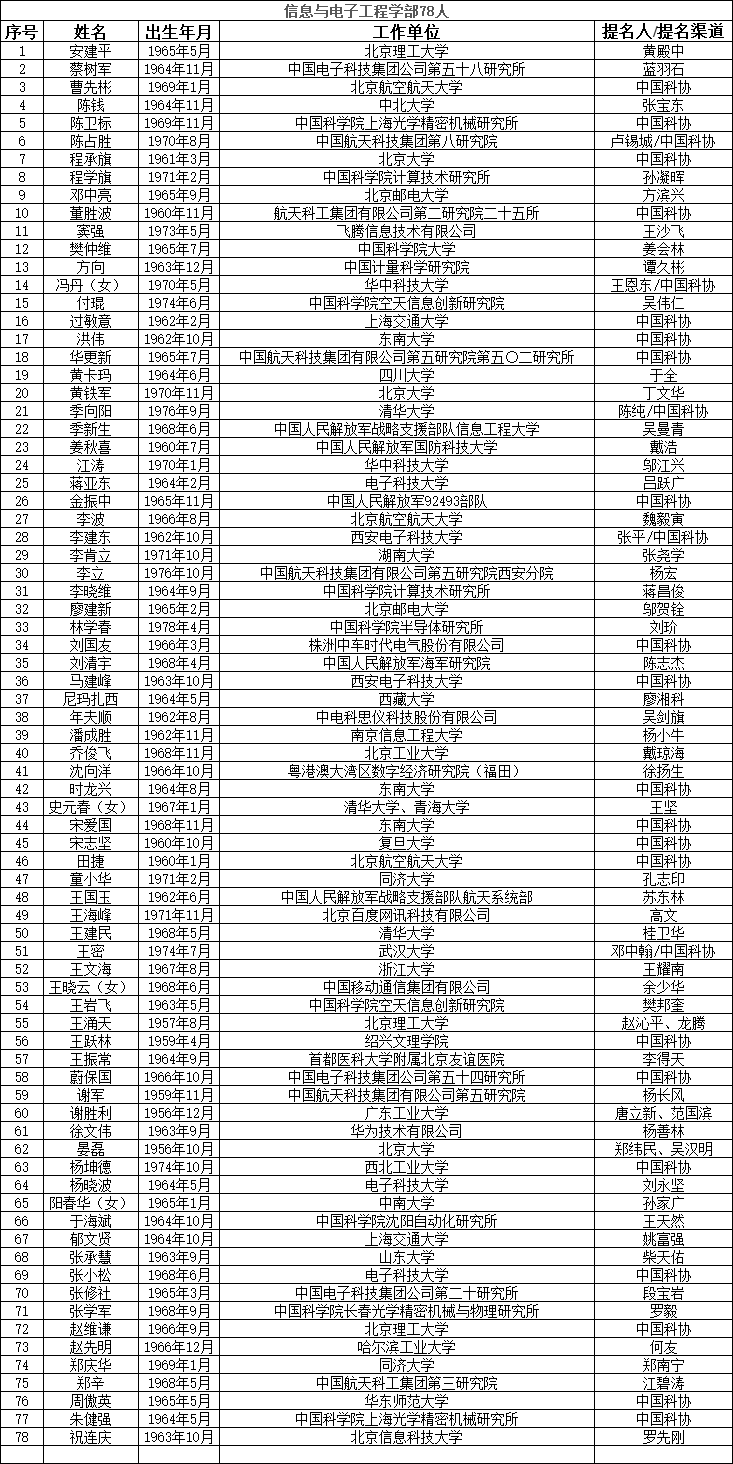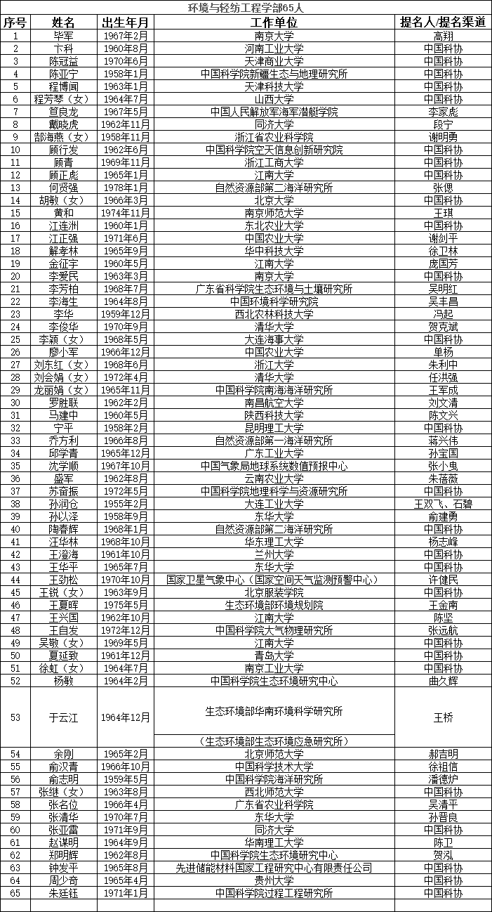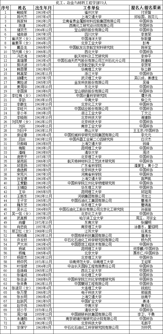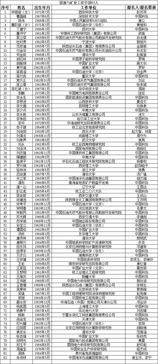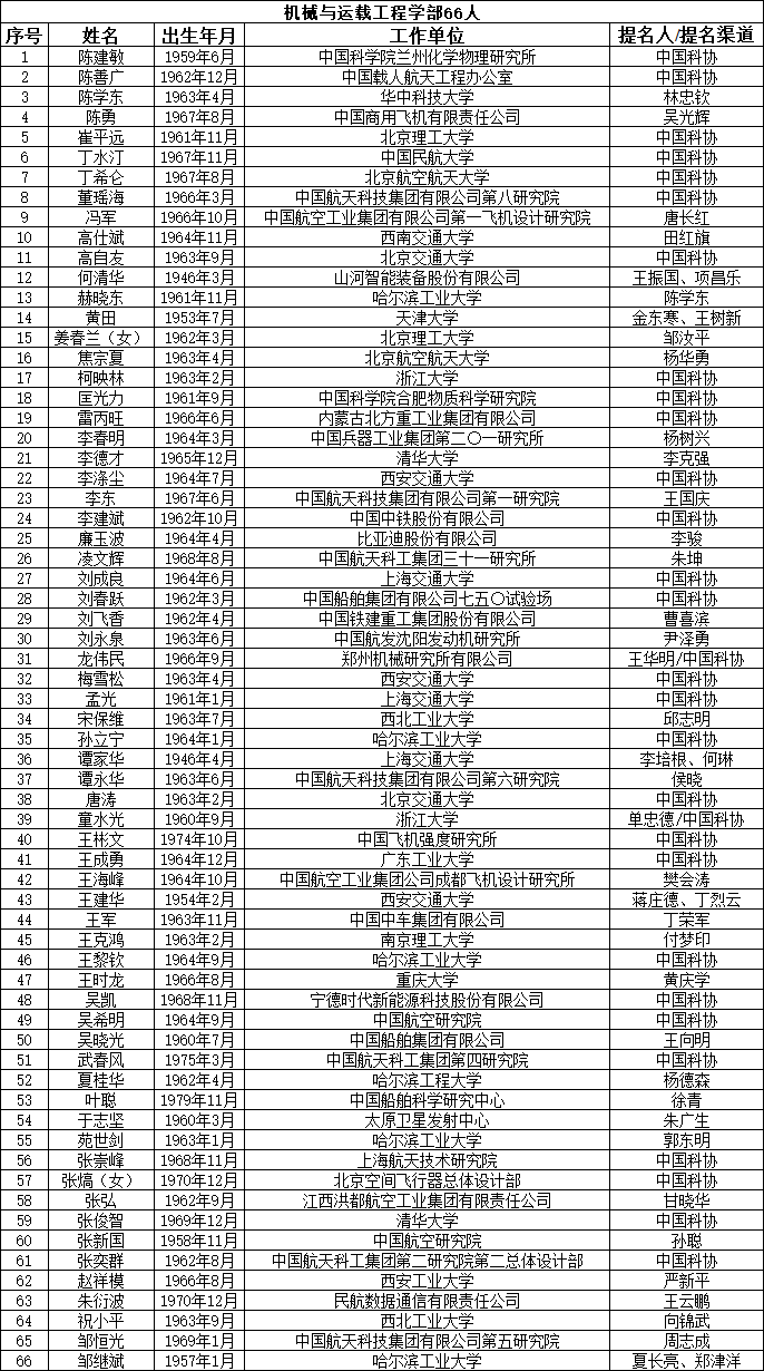 中國工程院2023年院士增選提名工作已經結束。經中國工程院第八屆主席團第六次會議審議,中國工程院黨組審定,確認中國工程院2023年院士增選有效候選人655人。根據《中國工程院院士增選工作實施辦法》的規定,現將有效候選人名單予以公布。