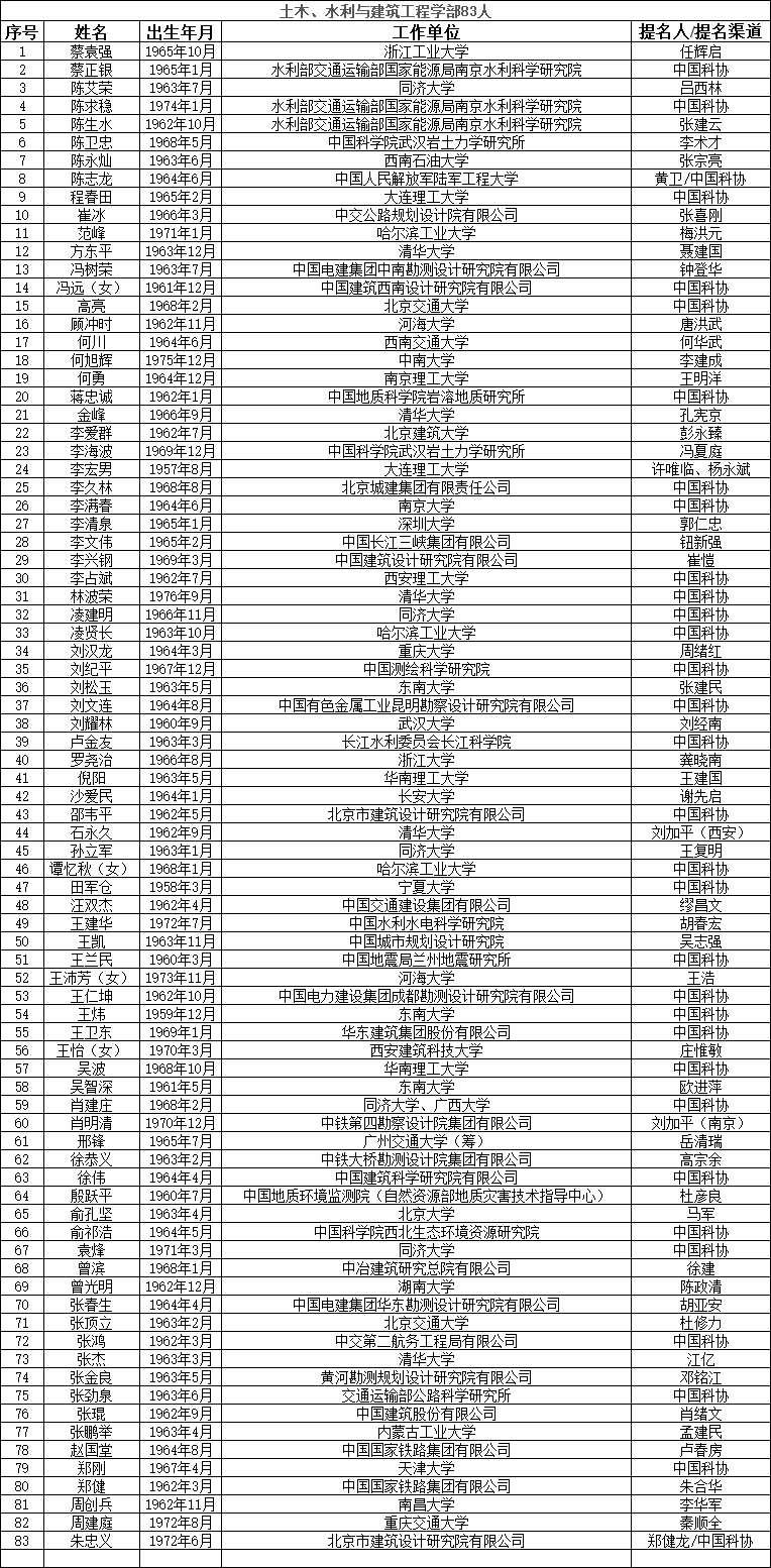 中國工程院2023年院士增選有效候選人名單