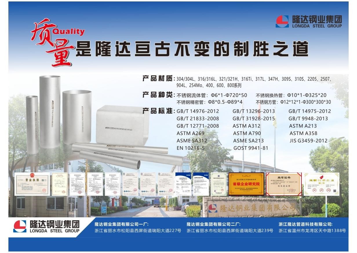 隆達(dá)鋼業(yè)集團(tuán)有限公司座落于麗水市風(fēng)景優(yōu)美的歷史古城—松陽(yáng)縣,是一家專業(yè)生產(chǎn)無(wú)縫不銹鋼管的現(xiàn)代化企業(yè),公司成立于2005年,注冊(cè)資本18500萬(wàn)元,占地面積40000多平方米,年產(chǎn)量18000噸。公司秉承"國(guó)內(nèi)領(lǐng)先,世界一流"的奮斗目標(biāo)和"質(zhì)量第一,誠(chéng)信為本"的宗旨,堅(jiān)持以"品牌戰(zhàn)略"為經(jīng)營(yíng)原則,引進(jìn)先進(jìn)設(shè)備,利用成熟的技術(shù)和工藝,向國(guó)內(nèi)外客戶提供高品質(zhì)的產(chǎn)品。一直以來(lái)“處鋼”牌不銹鋼管深受客戶的好評(píng),產(chǎn)品遠(yuǎn)銷(xiāo)二十多個(gè)國(guó)家和地區(qū)。