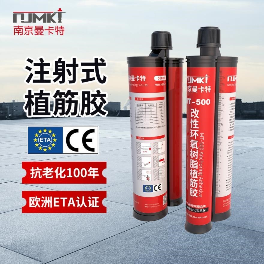 曼卡特MT-500植筋膠是雙組份包裝,通過混合嘴充分混合,適用于鋼筋在混凝土、花崗巖中的錨固,具有可施工時間長,快速承載,抗震、抗沖擊、耐疲勞200萬次、抗濕熱老化100年、耐酸堿、無蠕變等特點。通過歐洲ETA認證。