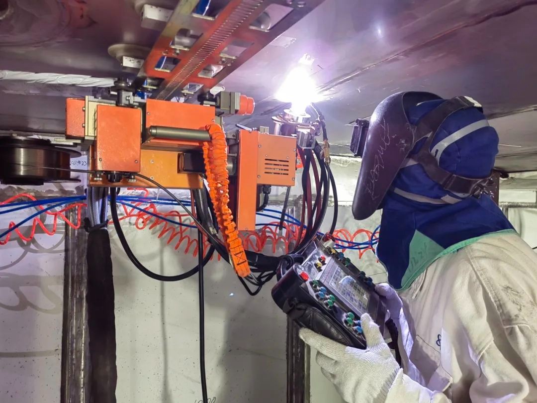 雙鎢極熱絲TIG焊是雙鎢極+熱絲高效TIG自動焊設(shè)備,通過對氬弧焊雙電源協(xié)同控制算法的研發(fā),實(shí)現(xiàn)兩支獨(dú)立鎢極電弧的耦合輸出。該技術(shù)集合雙鎢極電弧控制技術(shù)和TIG熱絲系統(tǒng),全面提高TIG焊的熔覆效率,突破傳統(tǒng)TIG焊焊接效率瓶頸,焊接效率較手工TIG焊提高4倍以上,首批焊接6臺設(shè)備同時進(jìn)行,2小時完成焊縫36m,全部100%合格,實(shí)現(xiàn)了高質(zhì)量、高效率的焊接目標(biāo)。