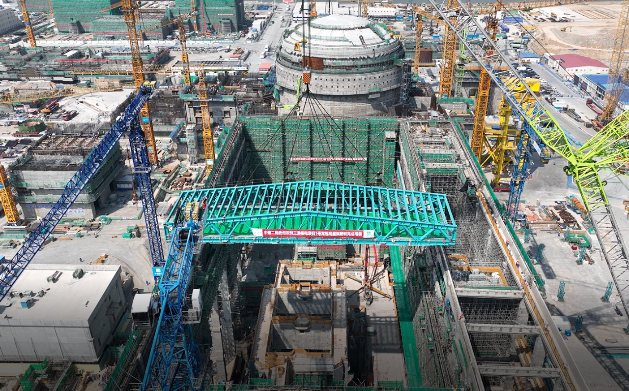 10月17日10時18分,隨著吊耳PT檢測順利通過,三澳核電項目1號常規島首次雙榀鋼屋架徐徐起吊,經過近2個小時連續動作,跨過BC列框架,最終實現與8-9軸框架預埋地腳螺栓的精準對位。本次屋架吊裝順利完成,為接下來1號常規島上部鋼結構施工、主廠房屋面封閉奠定了堅實的基礎。