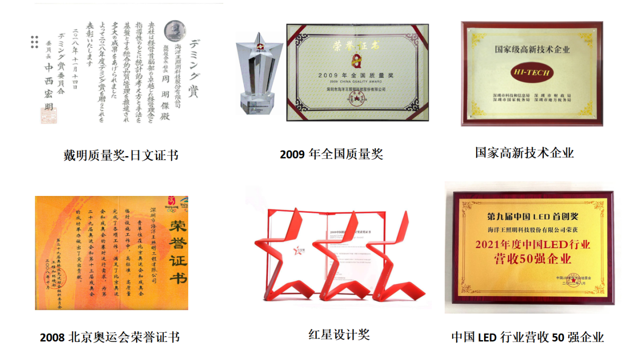 公司秉承“質量第一”,堅持做“負責任、有質量”的企業。獲得了多項國內外體系認證及產品認證,高于行業標準守護產品質量;2009年獲得“全國質量獎”,2010年獲得“全國質量管理星級評價五星級現場”;向世界先進企業學習,導入TQM,推進全員參與,2018年榮獲世界級戴明質量獎,成為國內本土第一家獲此殊榮的民營企業。2019年榮獲中國質量協會頒發的“全面質量管理推進40周年杰出推進單位”。2020年榮獲有“LED奧斯卡”之稱的中國首創獎,登上“年度中國LED行業專利50強企業榜首”,2021年再獲“年度中國LED行業知識產權50強”,同時榮獲了“廣東省專精特新企業”榮譽稱號等。