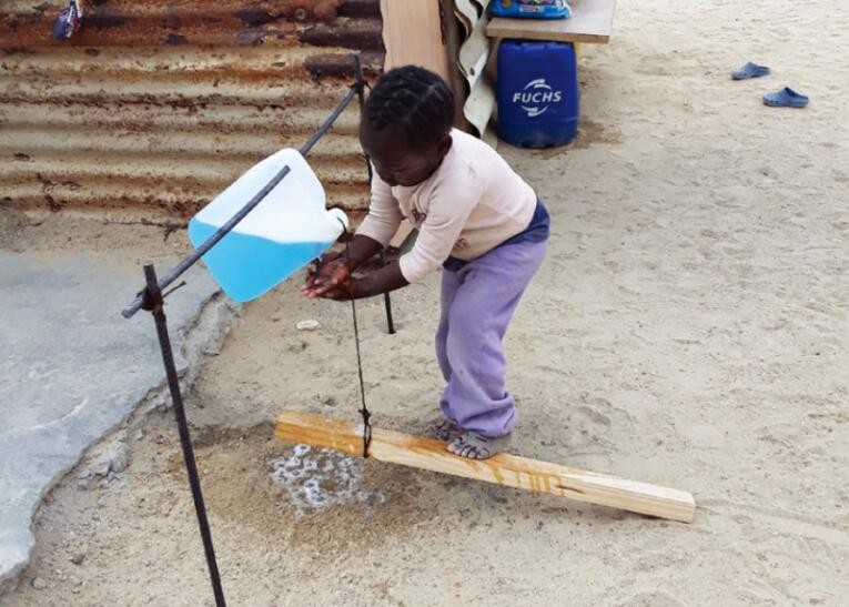 圖為中核集團控股的羅辛鈾礦為當地制作簡易洗手消毒裝置。(中核集團供圖)