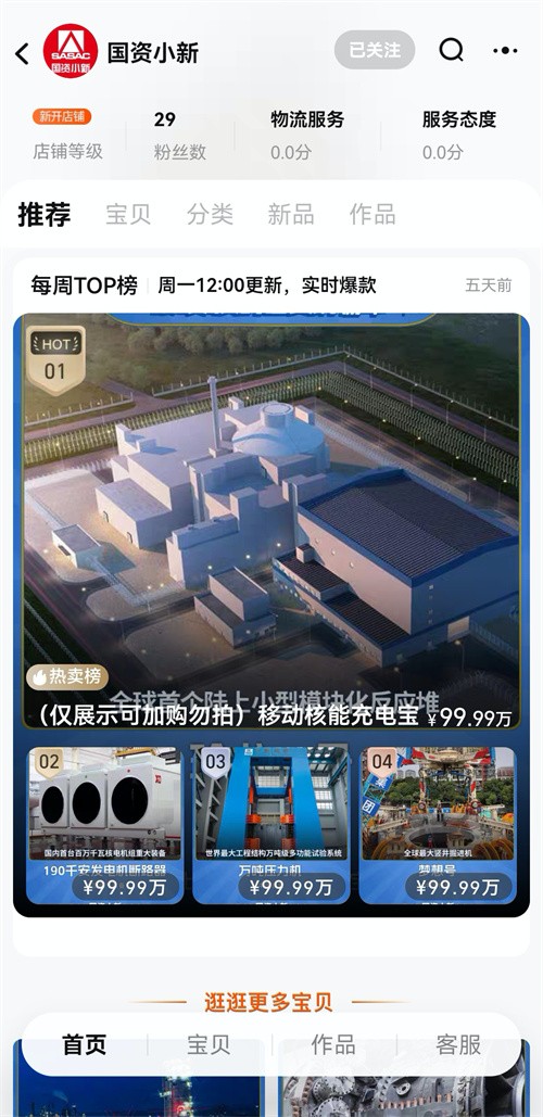 根據淘寶店鋪頁面顯示,首批上架的有全球最大直徑豎井掘進機、全球最大噸位橋面吊機、全球首創1.2萬米特深井自動化鉆機、全球首創干噴濕紡大絲束產品,還有被稱為“移動核能充電寶”的全球首個陸上模塊化小型核反應堆“玲龍一號”等。