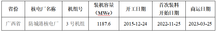 1)防城港核電廠3號(hào)機(jī)組2023年3月25日商運(yùn),機(jī)組2023年調(diào)試期間累計(jì)發(fā)電量、上網(wǎng)電量分別為8.02413億度、7.47180億度。