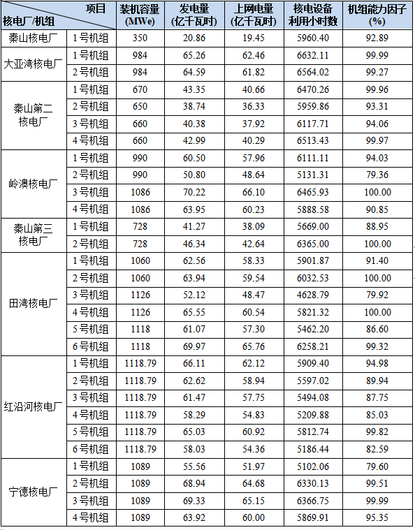 3)本表“合計(jì)值/整體值/平均值”中,裝機(jī)容量、發(fā)電量、上網(wǎng)電量為各機(jī)組合計(jì)值,核電設(shè)備利用小時(shí)數(shù)為全部機(jī)組整體值,機(jī)組能力因子為全部參與統(tǒng)計(jì)的機(jī)組的算數(shù)平均值。