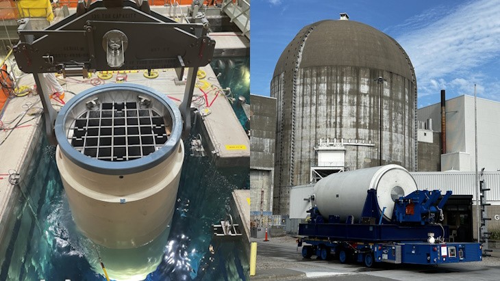 左圖:裝有 EOS 37PTH 罐的轉移桶被放入反應堆存儲池中,用過的燃料組件被裝載在水下。在將罐密封干燥存儲在 MATRIX 系統模塊之一之前,所有水分都會從罐內清除。右圖:使用自走式 SEFIRO 機動運輸車將屏蔽桶內裝滿的廢核燃料罐從 Wolf Creek 反應堆大樓轉移到 MATRIX 干燥存儲系統。(圖片:歐安諾)