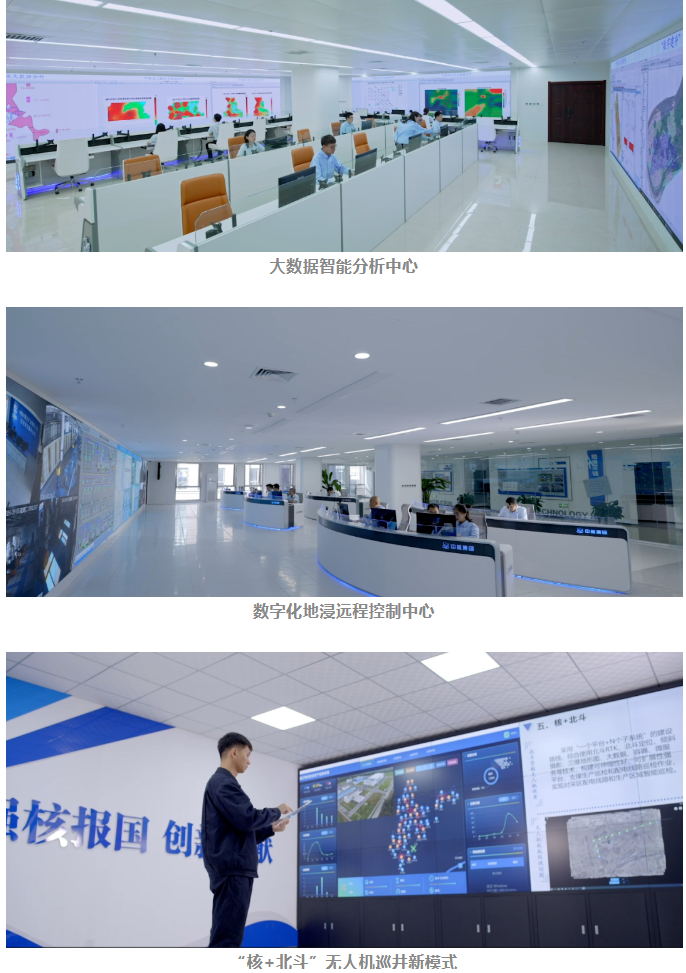 中核內蒙古礦業圍繞精準、高效采礦目標,以數字賦能,全力推進數字化轉型,增強地浸采鈾“新動力”。一是依托“大數據分析、機器學習、人工智能”等技術手段,攻克了采區數字孿生、采區運行快速診斷等技術,建成了國內首個地浸鈾礦山大數據智能分析中心。通過對生產海量數據的采集、存儲和挖掘,準確分析地浸井場運行變化趨勢,預測浸出條件變化對采區高效浸出的影響,有的放矢制定生產方案,達到精準控制、節能降耗的目的,為科學運營提供決策支持,發揮了“智慧腦”作用。二是打破傳統的鈾礦山生產運行管控模式,建成了國內首個地浸鈾礦山智能化遠程管控中心。遠程控制中心跨越區域距離界限,實現了對在役地浸鈾礦山遠程集中管控的全覆蓋。千里之外一鍵采鈾、一屏掌控,自控人員數量精簡50%以上,全員勞動生產率提升26%,年節省人力成本近百萬元,變“野外采礦”為“城市采礦”,邁出了鈾礦冶人城市化進程的第一步。三是針對地浸采鈾礦山傳統人工巡檢點多面廣、覆蓋面小、及時率低等問題,構建了“核+北斗”無人機自主巡檢平臺,創建“核+北斗”無人機巡井新模式,實現了“無人機巡檢為主,地面巡檢為輔”的協同巡檢目標,豐富了“機械化替人、自動化減人、數字化無人”的高效運行模式。通過全采區空地一體化管控,井場采區、供電線路巡檢覆蓋率100%,異常問題報警及時率100%,在數字化轉型升級進程中跑出了地浸采鈾“加速度”,奏響了高質量發展“最強音”。