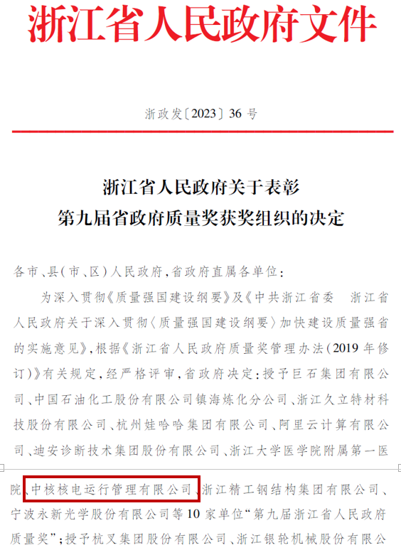 近日,浙江省政府印發《關于表彰第九屆省政府質量獎獲獎組織的決定》,秦山核電榮獲浙江省政府質量獎。