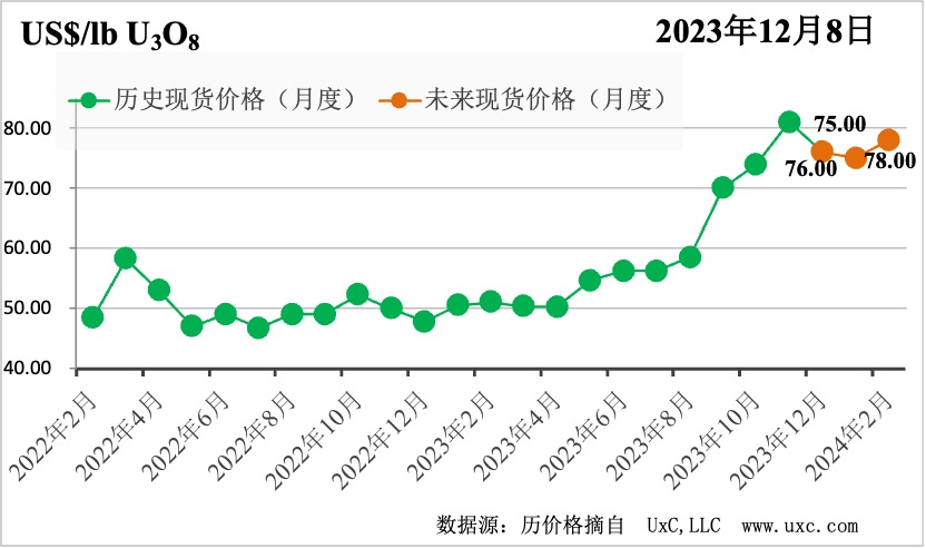 11月份現貨價格整體呈現上漲走勢。11月前兩周,市場交易不活躍,整體現貨價格延續上月水平,在74.00美元/磅上下波動。11月中旬,彭博社發布消息稱,美國將在第28屆聯合國氣候峰會上帶頭簽訂聯合聲明,推動全球核電裝機容量到2050年增加至當前三倍。消息發出后,迅速提振市場對核電發展預期,推動現貨價格上漲至76.90美元/磅。11月20日,SPUT宣布更新“ATM”股權計劃,預計融資1.25億美元,再次提振市場預期,天然鈾現貨價格上漲至81.00美元/磅,已達到2008年以來最高水平。