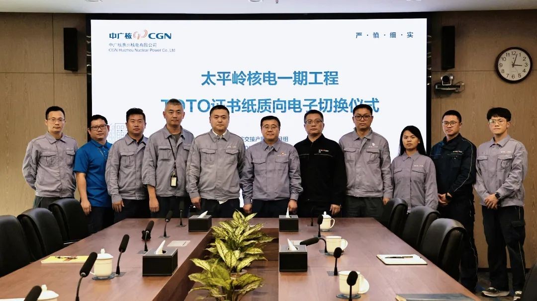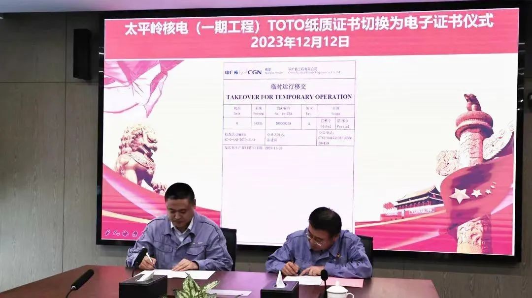 12月12日,股份公司生產準備PG組領導下的群廠共建、惠州核電牽頭開發的TIM證書電子化移交建設項目功能已全部完善,同時最后一份臨時運行移交(TOTO)紙質證書完成流轉簽字,正式切換為電子證書。太平嶺核電3T紙質證書的流轉和簽署正式退出歷史舞臺,移交接產證書由紙質向電子化轉化,體現了移交接產的創新與實踐。該項目的移交接產證書電子化成果將在群廠推廣使用,旨在為集團內外樹立標桿,落實“國際標桿工程”建設目標的有力行動舉措。惠州核電黨委委員、副總經理舒亮參與見證。