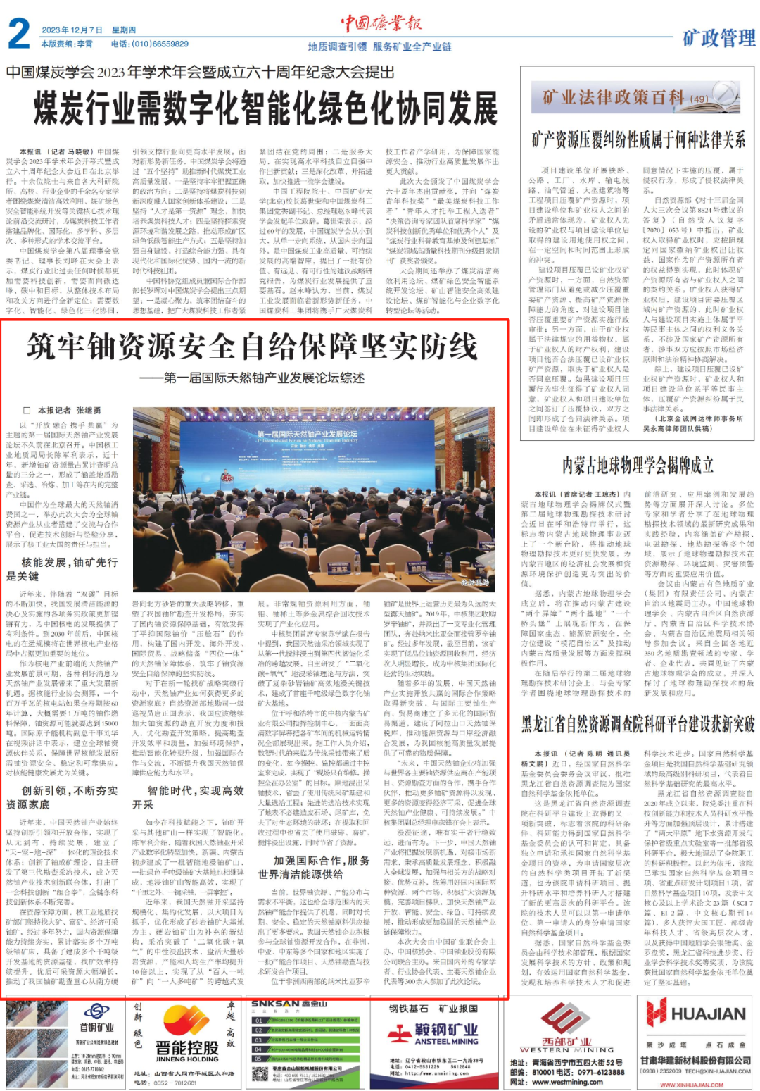近年來,中國天然鈾產業始終堅持創新引領和開放合作,實現了從無到有、持續發展,建立了“天-空-地-深”一體化的理論技術體系;創新了鈾成礦理論,自主研發了第三代勘查采冶技術,成立天然鈾產業技術創新聯合體,打出了一套科技創新“組合拳”,全鏈條科技創新體系不斷完善。在資源保障方面,核工業地質找礦部門堅持找大礦、富礦、經濟可采鈾礦,經過多年努力,國內資源保障能力持續夯實,累計落實多個萬噸級鈾礦床,具備了建成多個千噸級開發基地的資源基礎,找礦效率持續提升。優質可采資源大幅增長,推動了我國鈾礦勘查重心從南方硬巖向北方砂巖的重大戰略轉移,重塑了我國鈾礦勘查開發格局,夯實了國內鈾資源保障基礎,有效發揮了平抑國際鈾價“壓艙石”的作用,構建了國內開發、海外開發、國際貿易、戰略儲備“四位一體”的天然鈾保障體系,筑牢了鈾資源安全自給保障的堅實防線。對于在新一輪找礦戰略突破行動中,天然鈾產業如何獲得更多的資源家底?自然資源部地勘司一級巡視員唐正國表示,我國應該繼續加大鈾資源的勘查開發力度和投入,優化勘查開發策略,提高勘查開發效率和質量,加強環境保護,推動智能化轉型升級,加強國際合作與交流,不斷提升我國天然鈾保障供應能力和水平。