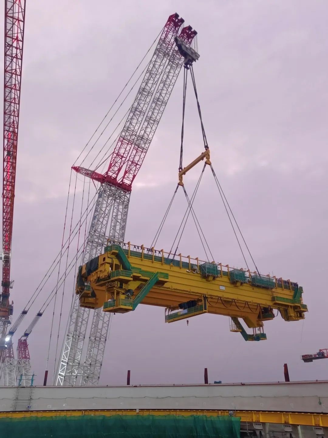 昌江核電4號機組核島環吊橋架及其旋轉機構主要包括主梁、端梁、5t鉤、平臺欄桿、司機室、大車旋轉機構、水平輪、斜梯、平臺、供梯平臺等部件組成,總重約417t,橋架對角線偏差控制在2mm內,調整精度要求高,打破以往核電項目環吊橋架整體組裝記錄。