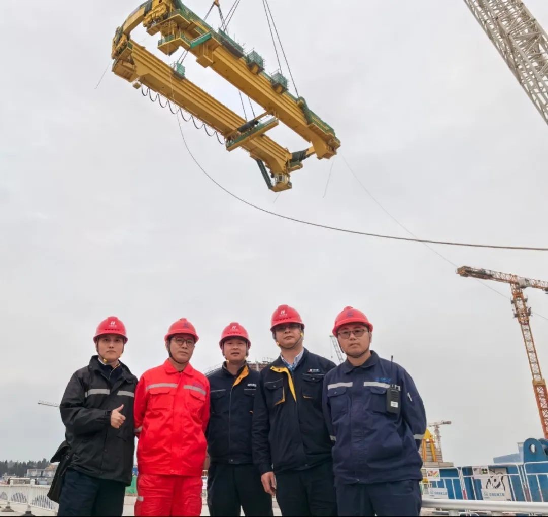 環吊橋架整體尺寸大、重量重,施工作業精度要求高、難度大。為順利完成吊裝工作,充分吸收其他項目經驗反饋,始終堅持“安全第一、質量第一”的原則,華能昌江核電公司聯合各參建單位建立日例會制度,每天10點準時召開專項會議,統籌協調現場問題并確定行動項,針對重點事項安排專人專項跟蹤,將每一項工作做細做實。各參建單位全力配合,嚴格把關各項工序,反復進行施工預演,梳理邏輯,在確保安全質量可控的前提下完成環吊橋架吊裝工作,確保吊裝一次性成功。