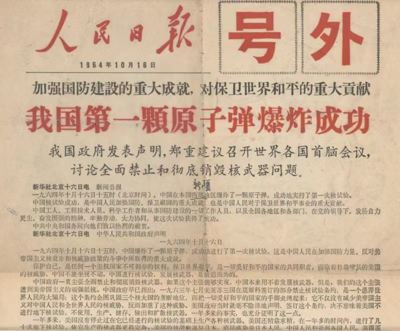 ▲1964年10月16日,《人民日報》以“號外”形式報道我國第一顆原子彈爆炸成功(圖片來源:《人民日報》官方微博)