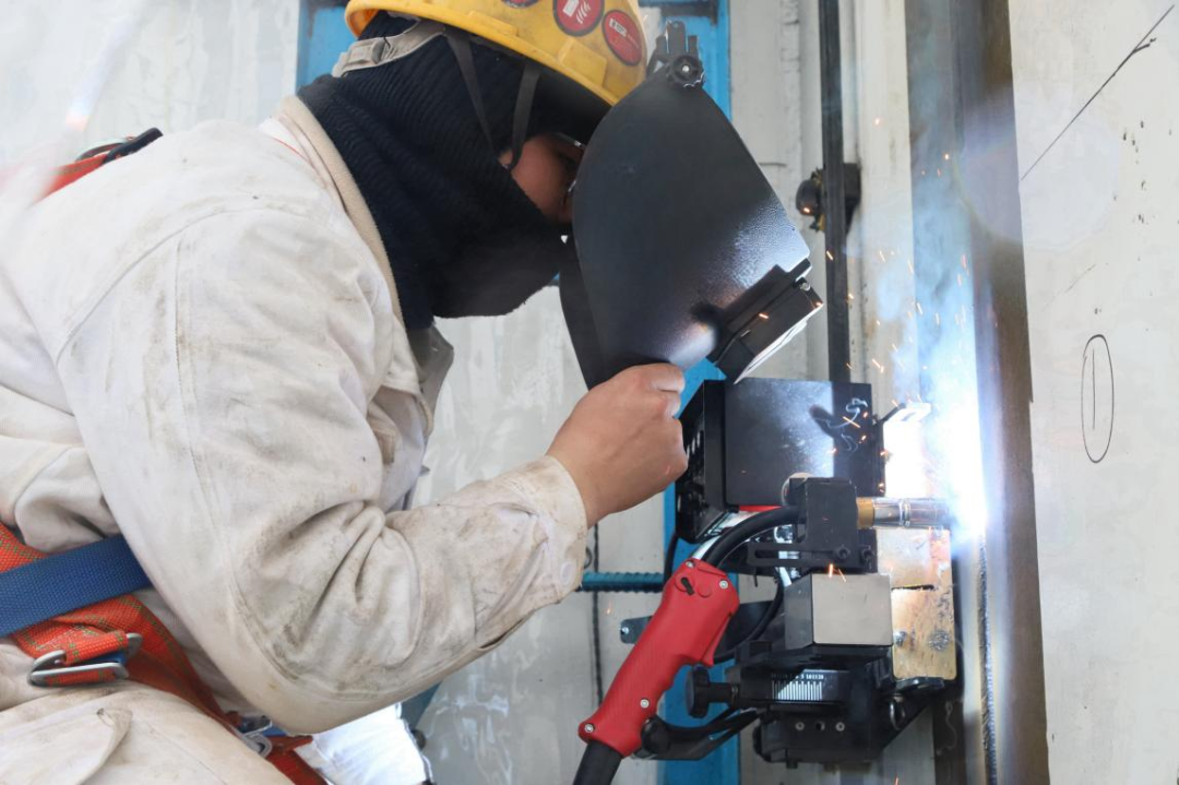 近年來,MAG自動焊技術已經成為建設領域的一種關鍵焊接技術。為打造輕便小巧、性能優越的自動焊設備,科研團隊對設備及小車軌道進行了輕量化設計,該設備僅重9kg,單手便可提起行走,并采用電池進行供電,解決了突發情況下設備墜落、焊縫中斷的風險,同時搭配磁吸輪履式爬行機構,移動倒運高效便捷,整體焊接效率提升3倍以上,焊接質量得到極大提高。